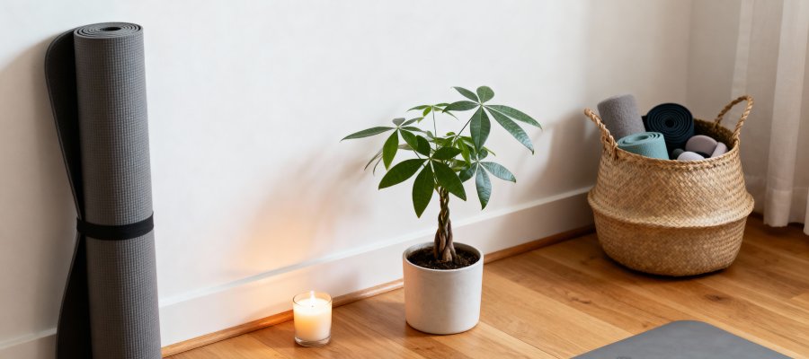 Crear un rincón de yoga en el salón funciona perfectamente para muchas personas. Elige un espacio que puedas mantener relativamente libre. Incluso si guardas la esterilla después, ese rincón será tu zona de práctica.