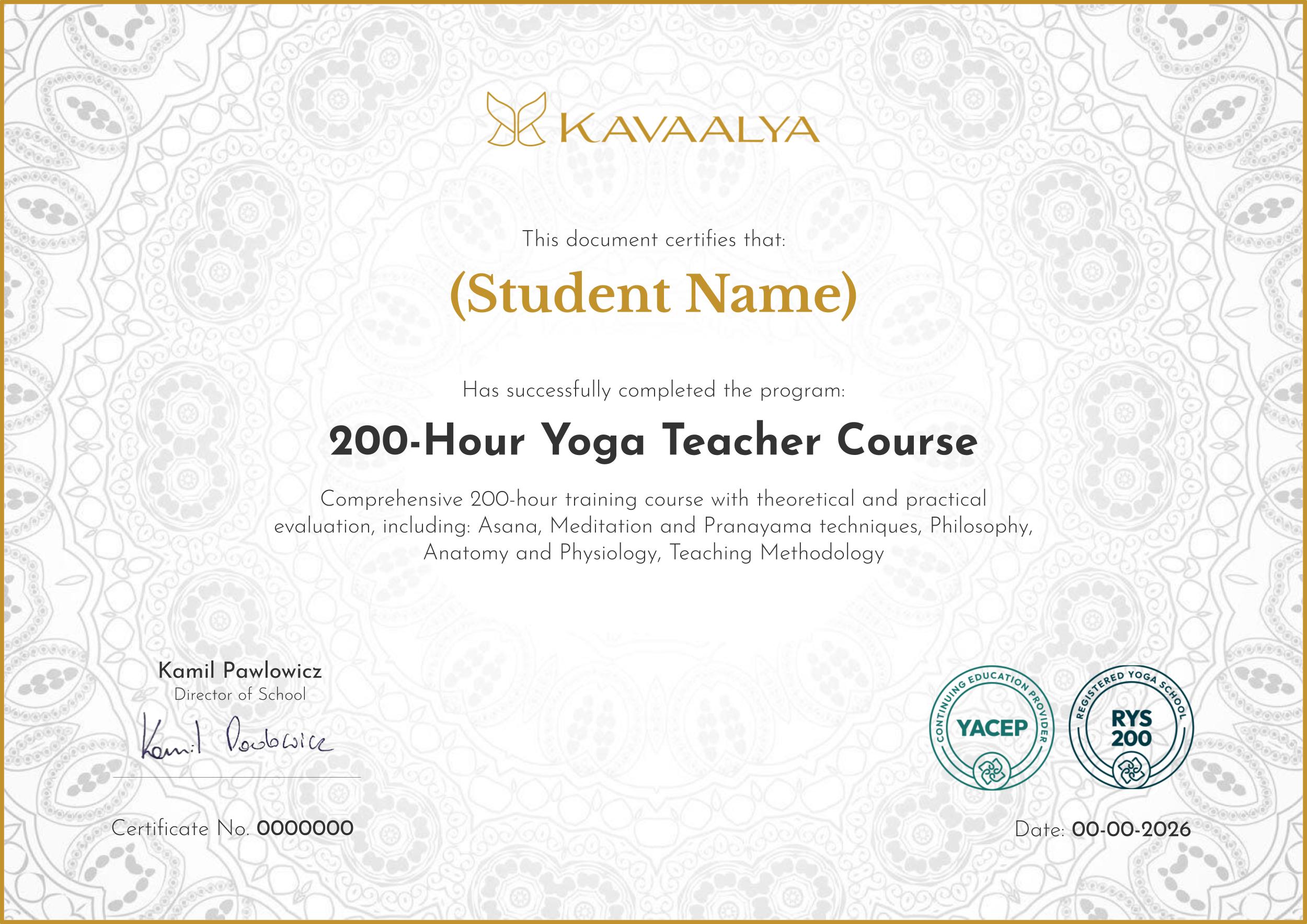 Per ricevere il certificato di aver completato con successo il corso e per poterti registrare come RYT-200 con Yoga Alliance, devi: